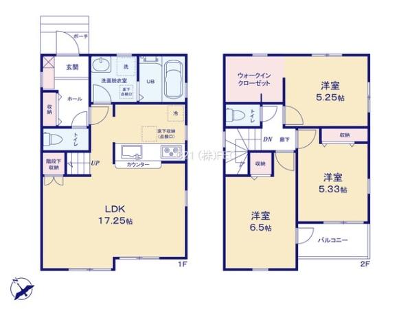 • 間取り図 1階は2面採光で明るく解放感のある17.25帖のLDK!2階5.25帖の洋室には収納力のある大型WICが完備!!