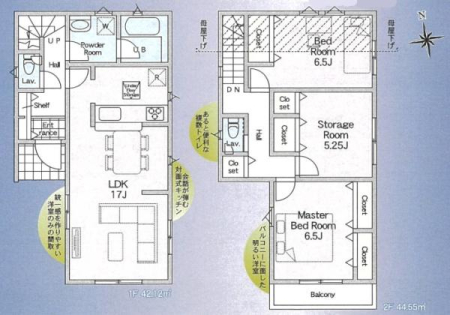 • 間取り図 1階22.3帖の広々LDKには人気の対面式キッチンと床暖房!3面採光で明るい空間です♪広々洗面室!2階全居室収納付きでお部屋がすっきり片付きます!7.3帖の主寝室にはWIC付き!南面ワイドバルコニー!